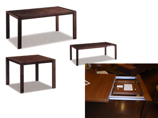 来客の人数や、お料理の数が増えたときなど、伸長式テーブルが便利です。2人掛けのダイニングテーブルが、4人掛けの大きさに、4人掛けから6人掛けの大きさに延びるものがありお部屋の大きさや用途に合わせてお選びいただけます。